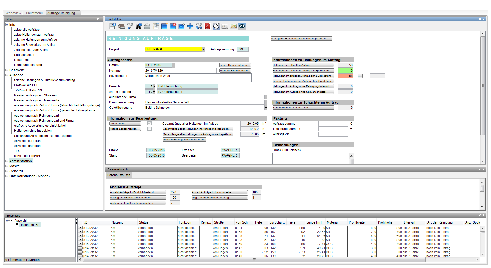 Zusammen mit dem Eigenbetrieb Hanau Infrastruktur Service wurde ein Modul zur bedarfsorientierten Kanalreinigung entwickelt. Mit einer integrierten Auftragsverwaltung und dem Einsatz mobiler Erfassungssysteme ist der Eigenbetrieb in der Lage Spülfrequenzen in Abhängigkeit tatsächlicher Verschmutzungsgrade / Ablagerungshöhen komfortabel zu berechnen und zu planen. Neben der Zeitersparnis durch intelligente Planungsfunktionen, ist bereits nach kurzer Zeit eine Kostensenkung für die Kanalreinigung festzustellen.